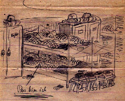 Heute Mittag gab es Haferflockensuppe. Da hab ich mich wieder mal voll gegessen. Es gibt jetzt das Mittagessen immer Abends, weil da die Einsatzzüge kommen. – Schlafen tue ich jetzt bis um 7.00, obwohl um 6.00 wecken ist. Dann gehe ich waschen, ziehe mich an, baue mein Bett etwas und frühstücke. ½ 8 gehe ich dann auf die Schreibstube. Da hat ein Leichtkranker bereits Feuer gemacht, entdunkelt u. Staub gewischt. Dann fange ich an zu arbeiten. –